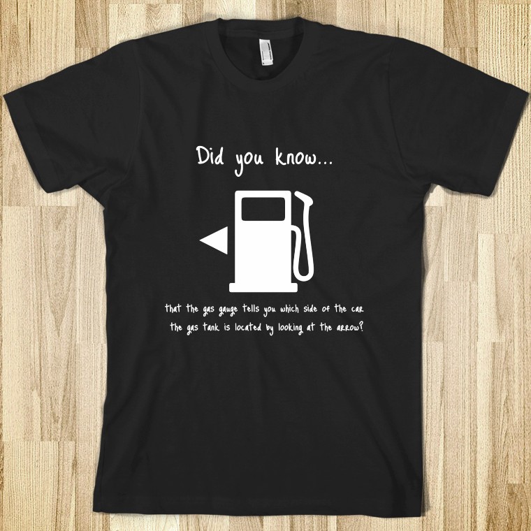 How many times have you pulled into a gas station in a rental car and wondered – which side is the gas tank on? Instead of having to get out of the car to check for the gas tank, there is such a thing as a “Dashboard Fuel Pump Icon” that shows you which side of the car you will need to fuel up. Check out the t-shirt photo (left) for the icon and check your dashboard in your car.