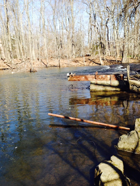 And so it went.  We visited our childhood home and did the usual – took photos outside of where we went to school, drove past old friends homes and another very special thing – we found the old swimming hole.  We had to hike back by the river in mud and leaves, but we found what remained of the diving board, the shuffleboard set and the swing-set. diving board