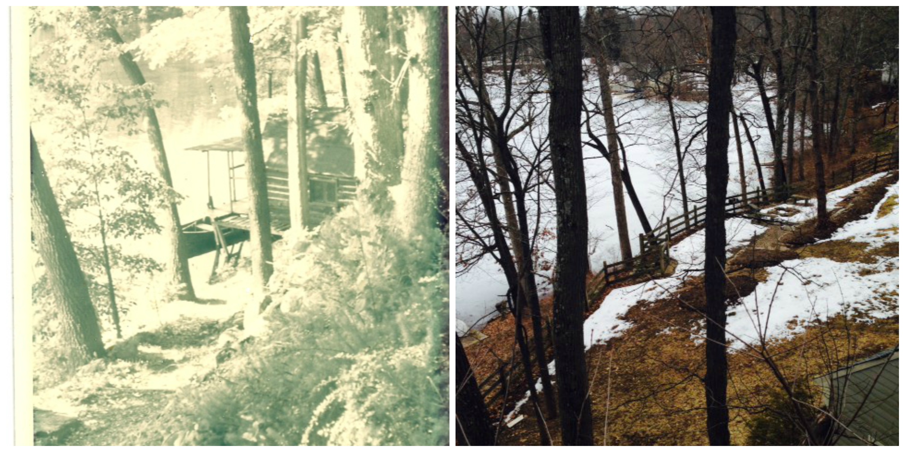 There really only was one sobering moment, at least for me, and that was the visit to my “Lake Grandma’s” house.  She was my father’s mother and we visited her often.  It was there that I have the most vivid childhood memories.  We would walk up the road to get water from the pump, eat meals outside in the rock wall garden, take the row-boat out on the lake and go fishing, and swim all day long.  Her house had two separate smaller houses – one was a log cabin which my father and his brothers lived in, and the other was my Aunt Ellen’s house.  The three houses had been torn down and replaced with a rather large edifice.  There was not one thing that looked the same, so we walked over to the neighbors and I took a photo looking down at the lake where the log cabin stood – now and then.