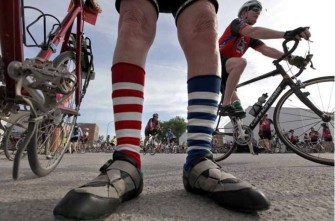 Our team was “The Moving Tassles” and we were just one of hundreds of teams. Each team had their own unique flair. Throughout the course of the week, I enjoyed discovering all the nuances each team had to offer – The Pink Flamingos, The Lizard Kings, The Aristocats, The Loons, Team Spin, and my personal favorite – Team “Biking Bad” featuring Walter White and Jesse Pinkman. Every team had their defining accouterments and themes. Some teams were costume based; tu-tu’s, boa’s, thongs, (yes, thongs), horns on helmets and feathers (to name just a few). Bikers rode with their dogs in tow, and even their Cockatoo’s. Charitable teams and worthy causes showed up; the Livestrong Foundation Group, and the Ed Thomas Foundation Team, whose riders supported Aplington Parkersburg former football coach Ed Thomas, who was shot and killed by a former player in the school’s weight room in 2009. There was the girl who rode the entire ride in combat boots to raise money for veterans and their families through the nonprofit Boot Campaign and there was Team Gourmet, whose team members carried wooden spoons with catchphrases on them, honoring Wayne Santi, the team’s founder, who died of heart failure at the age of 65 in October. Wayne will be remembered for his role as food manager and planner for the team by inscribing his inside jokes on the spoons, “more butter” or “another grape please” to name a few. An entire day was dedicated to Carter LeBeau, a Davenport Iowa biking guru who died in August 2013 at the age of 87. LeBeau was one of only eight people to participate in RAGBRAI for 40 years straight since its start in 1973. Every mile he sported vintage soccer socks so those who honored him on Friday of the ride had an entire ensemble of mixed match socks.