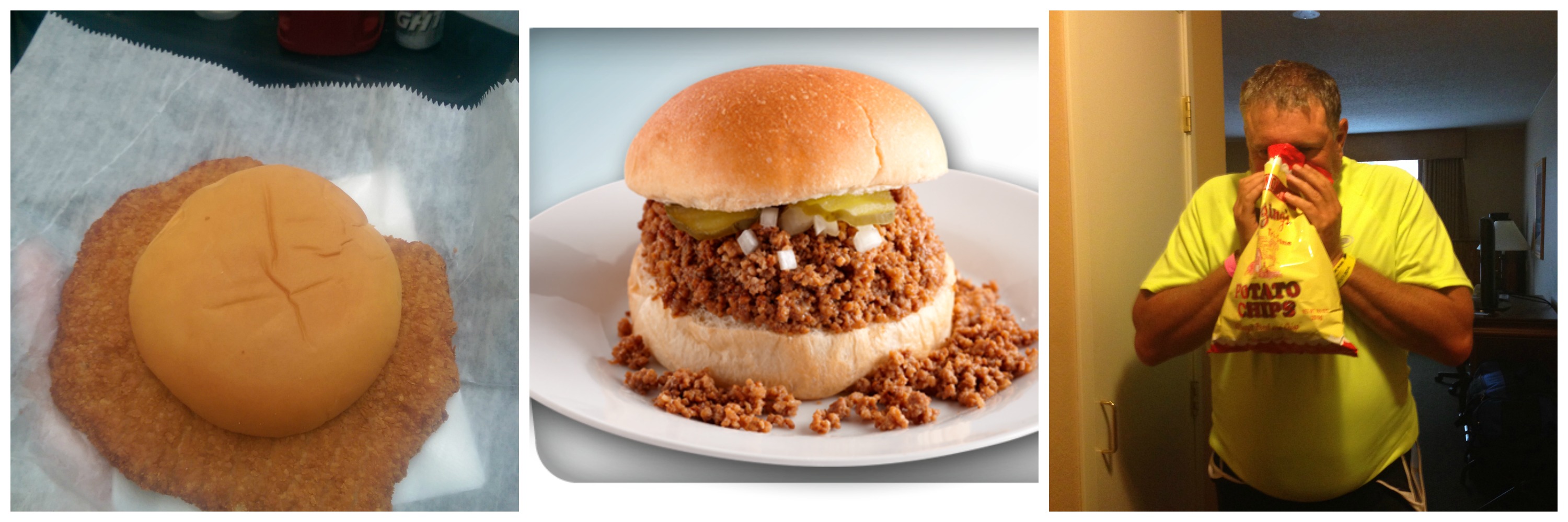 I really did not comprehend how food is such an integral part of the ride until day three. That’s right – day three. That’s when I rode with a seasoned RAGBRAI veteran who, at every stop, had me try all the various goodies that were available and I normally would not have thought of. Quite honestly, the first two days I was a little bit overwhelmed – trying to get in the swing of it and figuring out the ebb and flow of the ride. After encouragement and introduction, I got my groove on and dipped the waters into a food frenzy, a smorgasbord of butter, sugar, pork, chocolate and ice cream. I had my fair share of “scotch-a-roos”, a delicious combination of peanut butter, chocolate and butterscotch – an exciting version of a rice krispie treat wrapped in cellophane…delicious. The corn on the cob, dipped in butter, was to die for, and then there is the pork. Pulled pork sandwiches, pork tenderloins, Jim’s BLT’s, bacon dipped in chocolate and served on a stick (the town that premiered this food item made 850 such delicacies and sold out in under two hours.) There was Beekman’s Ice Cream, smoothies, and of course, Pie. Cherry, Apple, Strawberry, Blueberry, Mixed Berry, Triple Berry, Rhubarb – the list goes on and on. Every community hosted spaghetti dinners, lasagna dinners, and all you can eat buffets. Along the route I saw food vendors like Mr. Pork Chop, FreezeYourNoggin, the Lemonade people, the home-made ice cream people, the Dove Barn, and a dozen others. You had traditional Iowa foodstuffs; pork tenderloin sandwiches, maid rites and of course, Sterzing potato chips. As you can see, my husband is so in love with them he had to insert his nose into the bag just to have the scent waft over him. Vendors set up their tents, chow wagons, etc. in strategic places along the route. There were pancake breakfasts in the morning put on by Kiwanis Clubs and at night, buffets at local churches where the masses were fed.